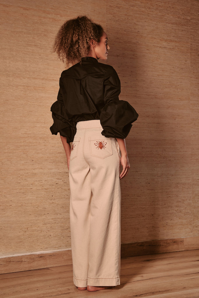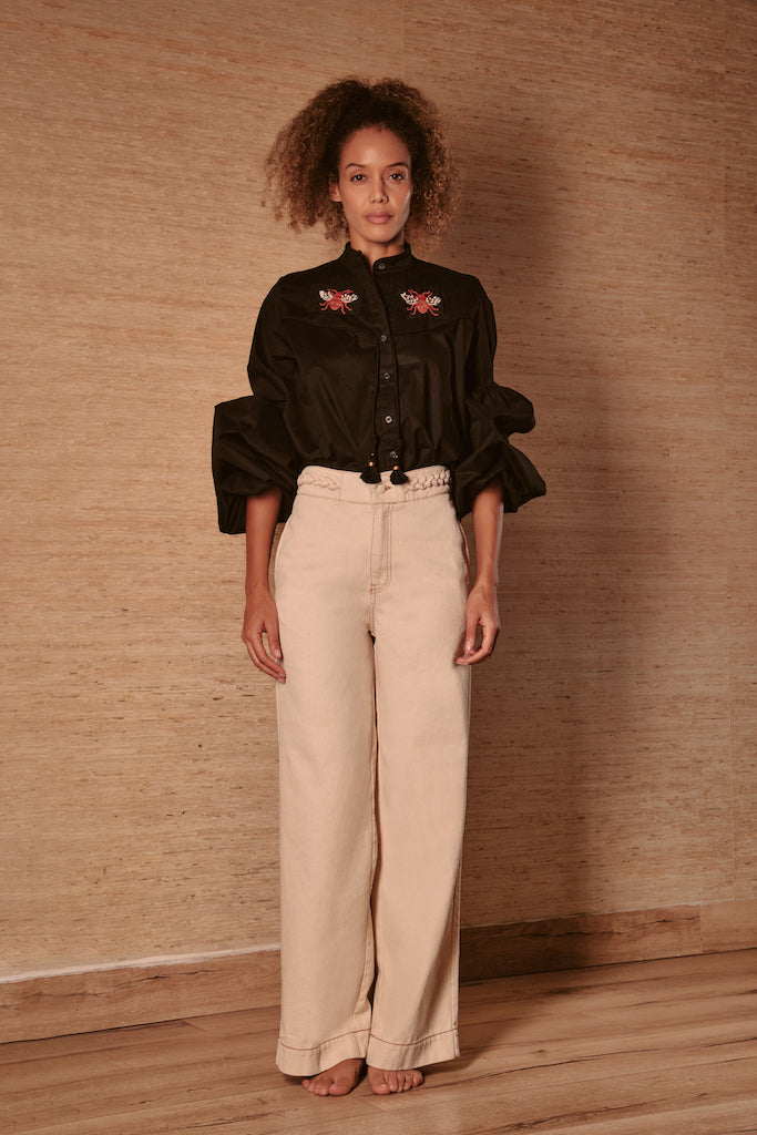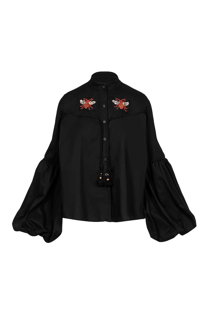 Nuestra Camisa Negra, con mangas largas y abullonadas, destaca por su elegante cuello medio alto y delicadas abejas bordadas en el pecho. Confeccionada en tela suave y resistente, es la elección perfecta para quienes buscan sofisticación con un toque creativo.