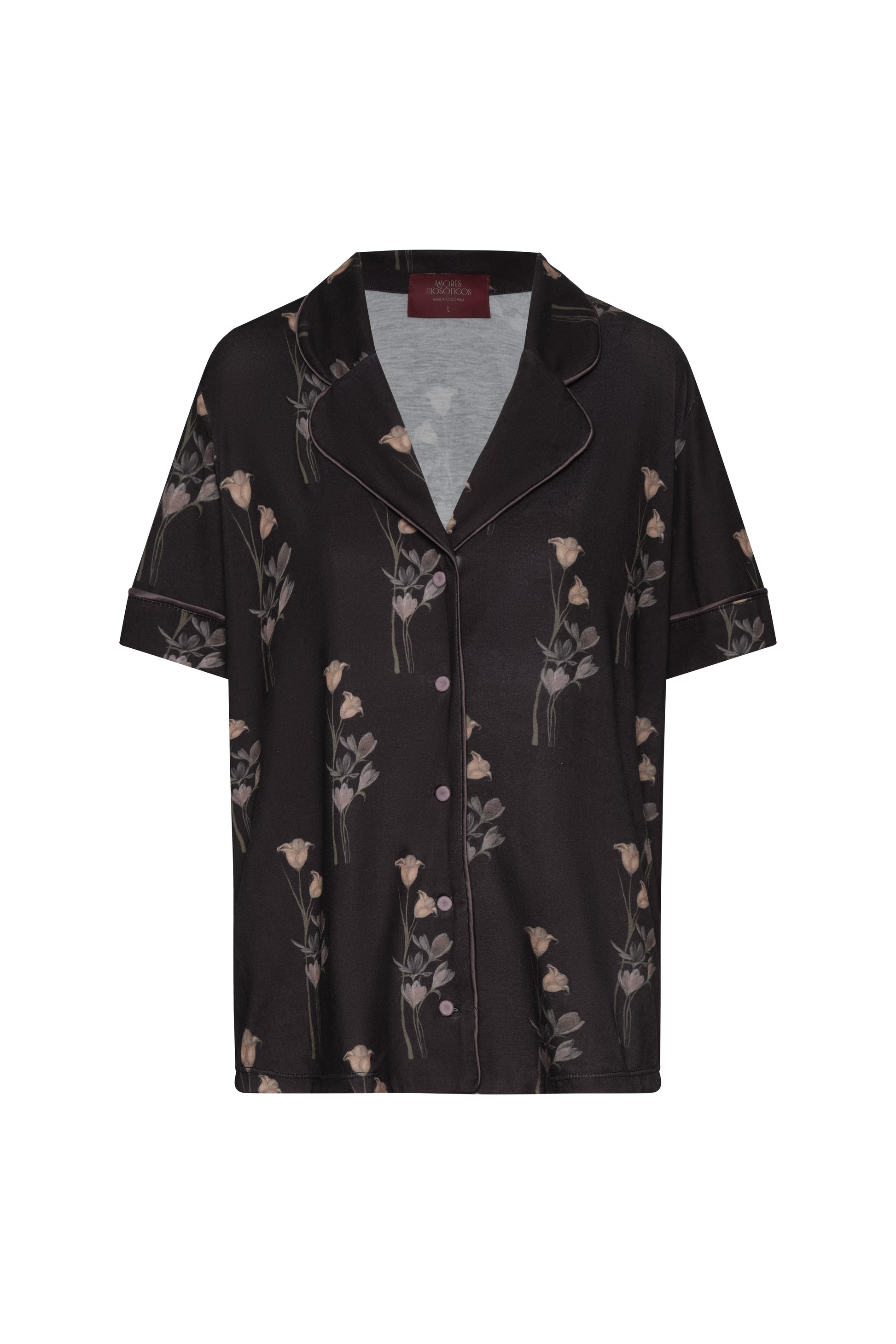 Pijama elaborada en algodón con print Floral con vivos morados oscuro, la camisa con abotonadura en la parte delantera con botones forrados de color morado.