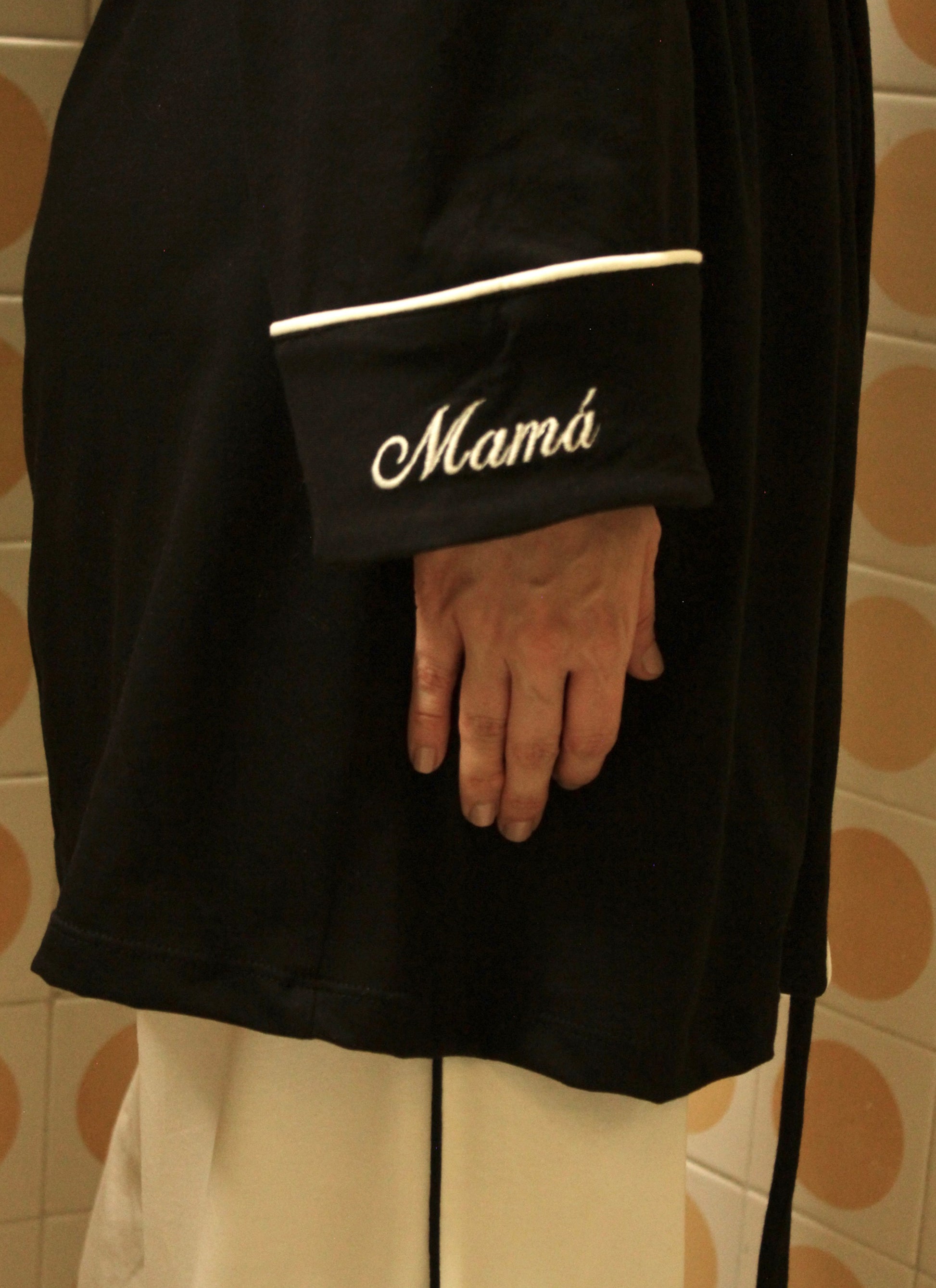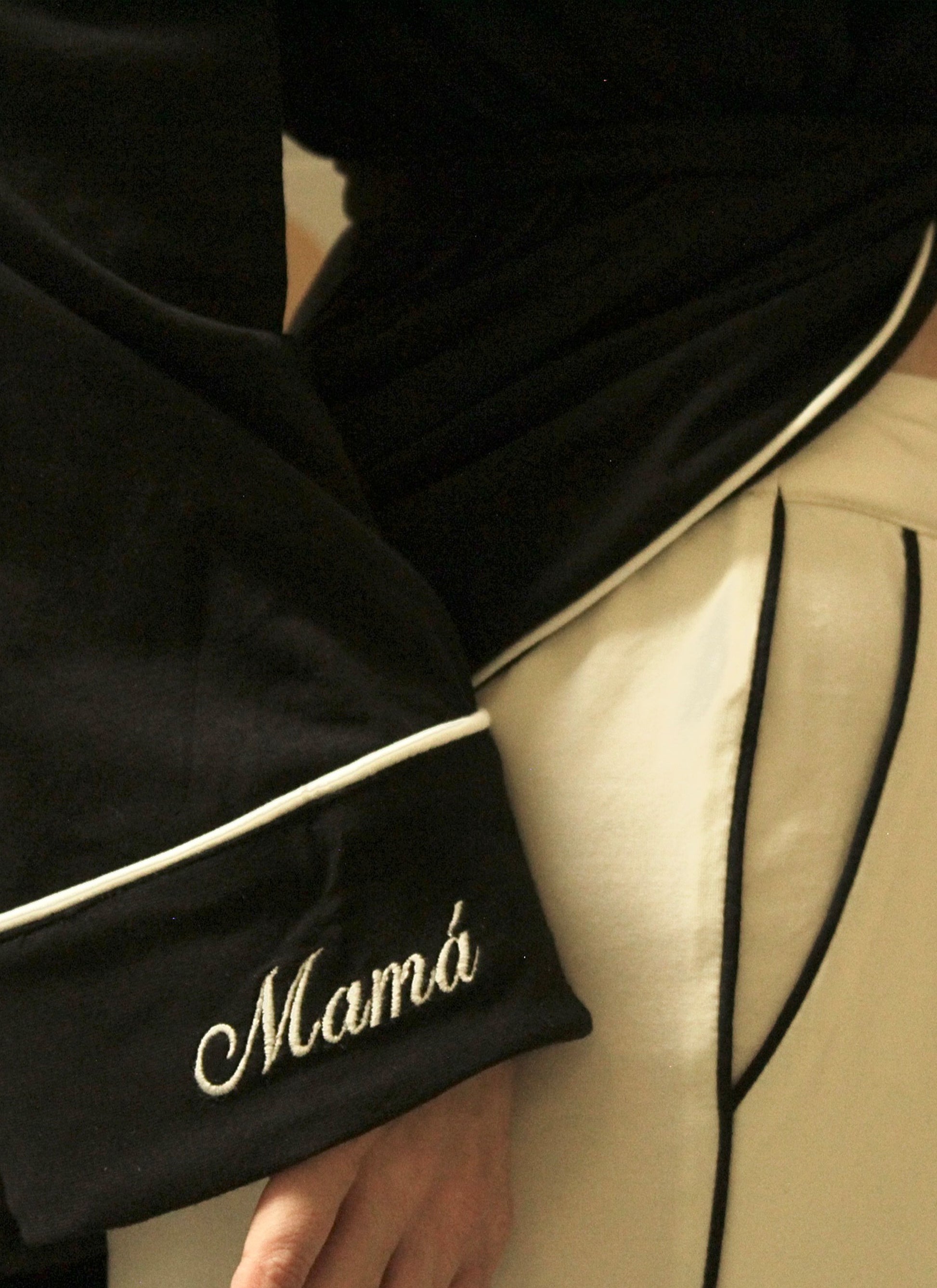 Bata del largo perfecto antes de la rodilla, es una bata clásica, elegante y versatil, la puedes usar encima de la pijama para dejar los niños en el bus o para recoger algún paquete en porteria. Elaborada en algodón negro con vivos a contraste color ivory, tiene bordado el puño con la frase que quieras personalizar (MAMÁ ó MOM), es manga larga y tiene un lazo para que puedas graduar y amarrar. Es una bata que te hace fondo de armaria en tus set de pijamas.