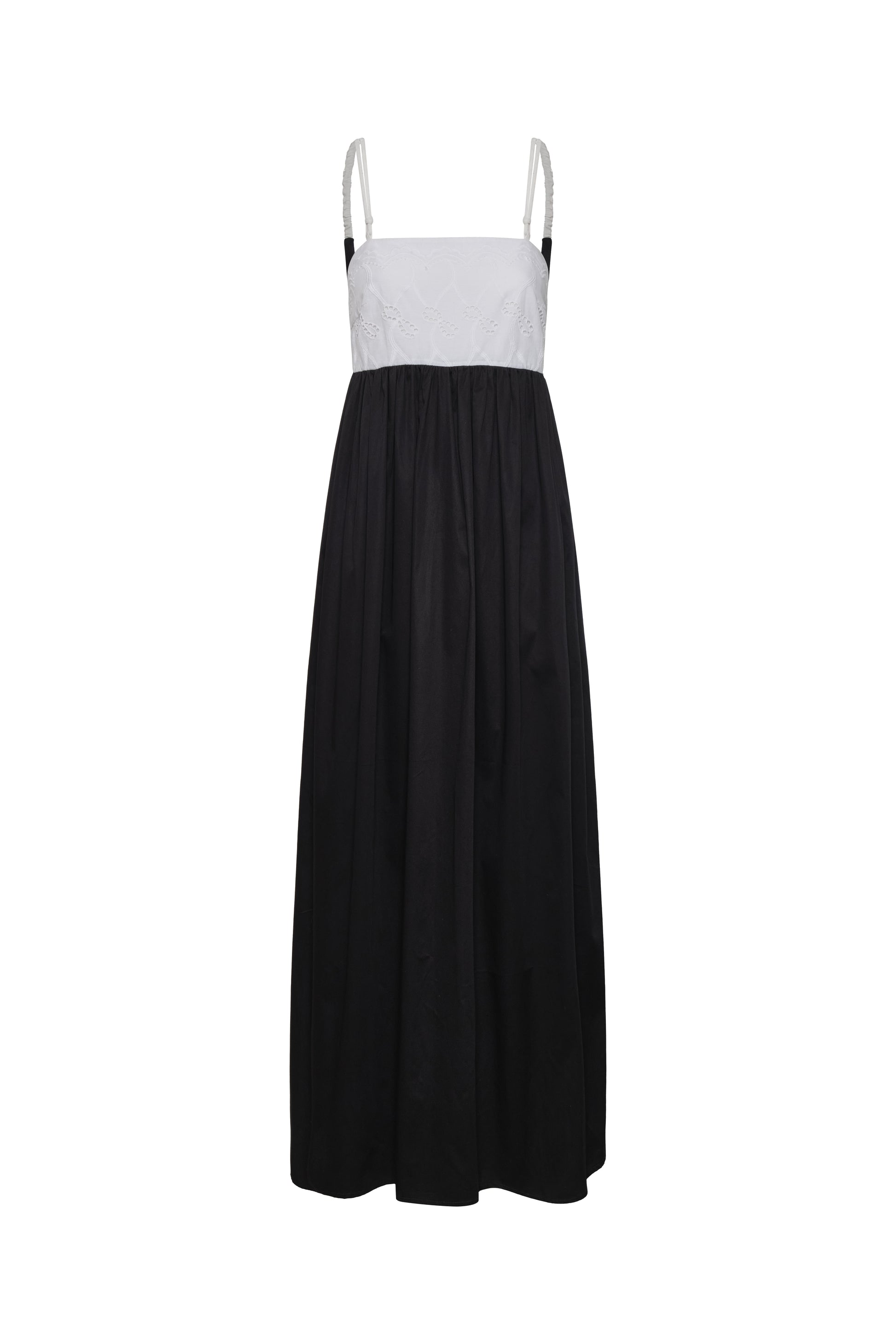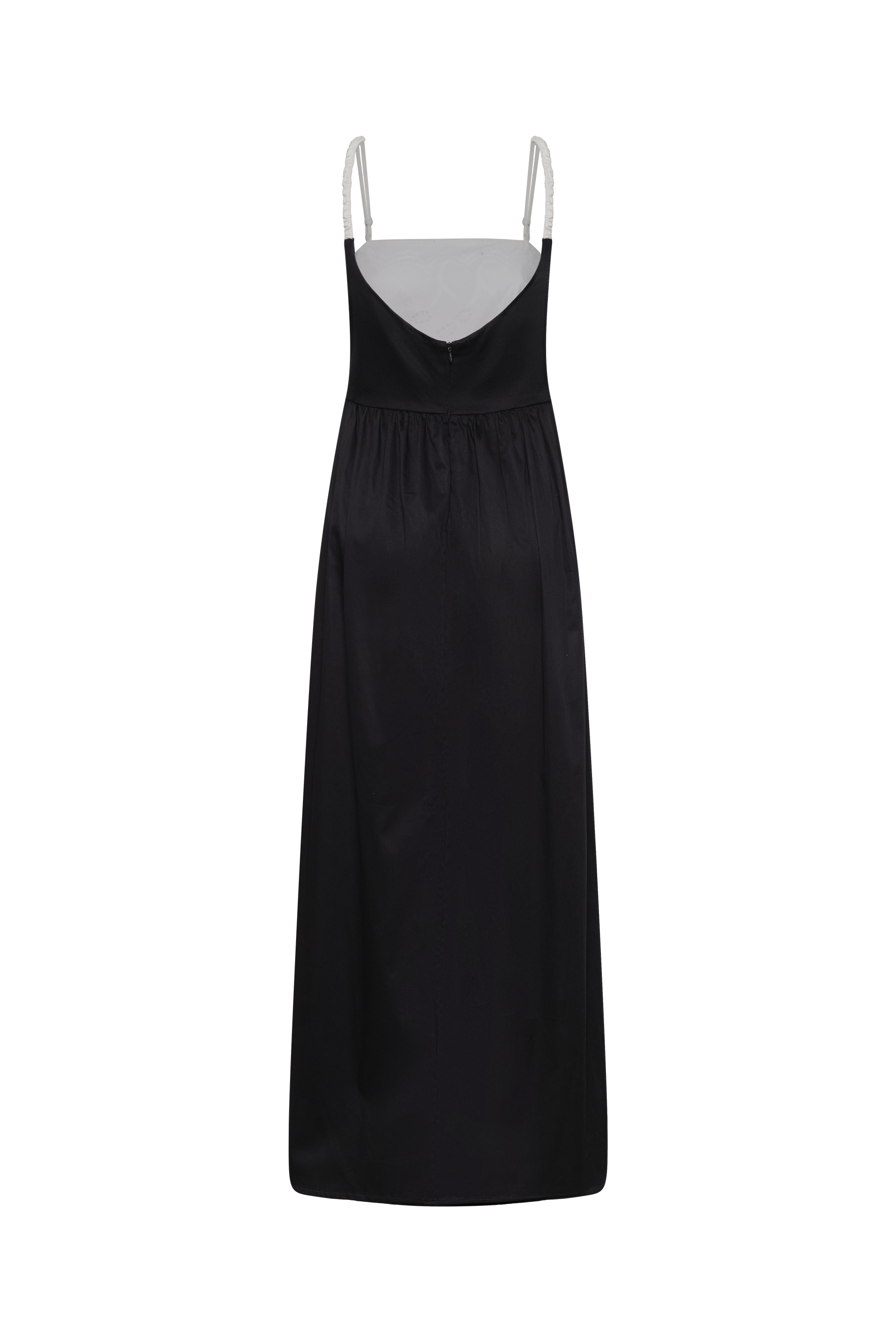 Vestido elaborado en popelina negra con la parte del busto en hoja rota, un corte en linea A que le favorece a todos los cuerpos.